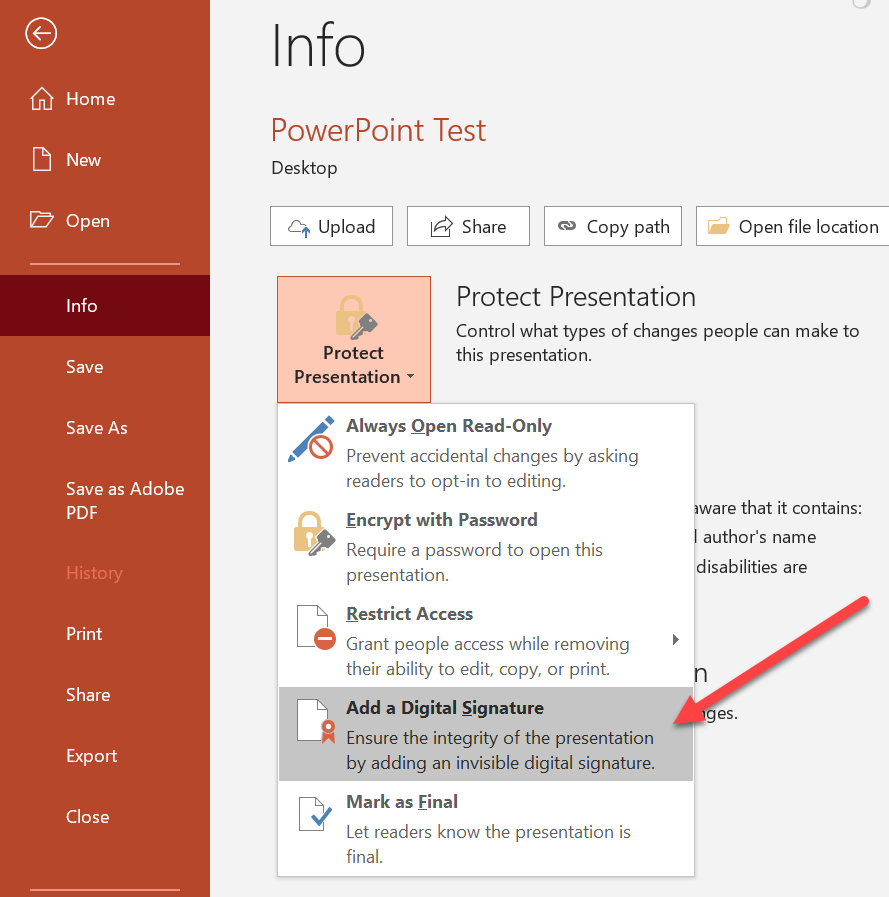 - Periksa apakah PowerPoint ditandatangani.
