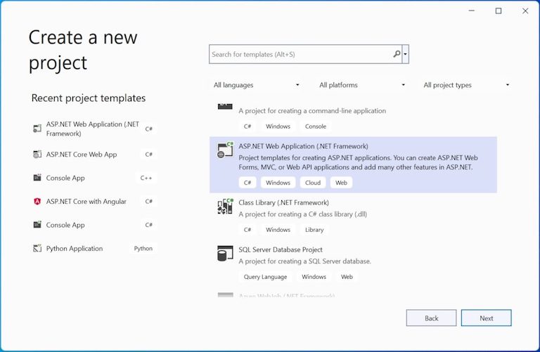 - まず、新しいプロジェクトを作成し、ASP.NET Webアプリケーション(.NET Framework)プロジェクトテンプレートを選択します。